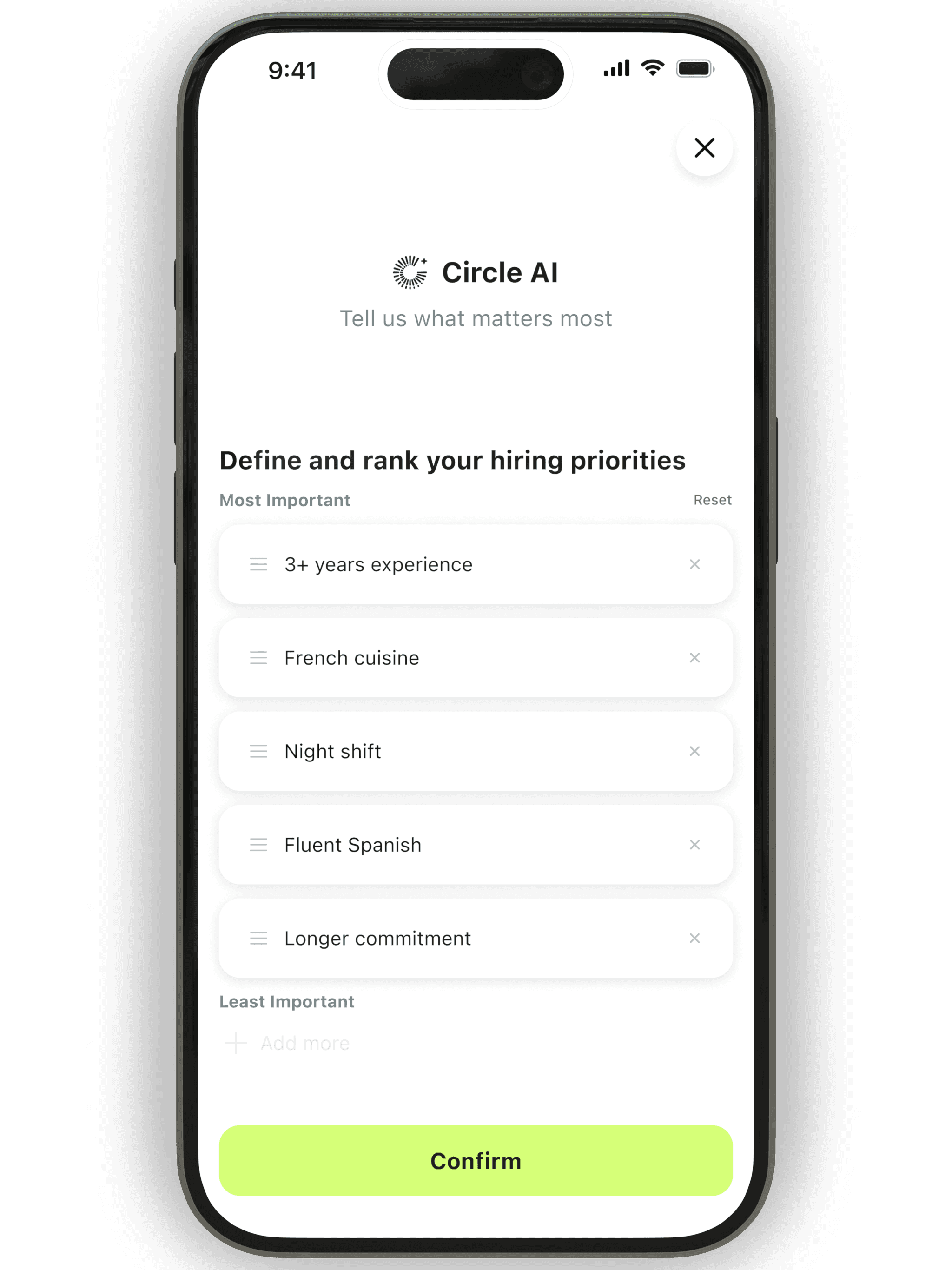AI rankings are adjustable based on recruiter priorities such as experience, availability, certifications, or role-specific skills.