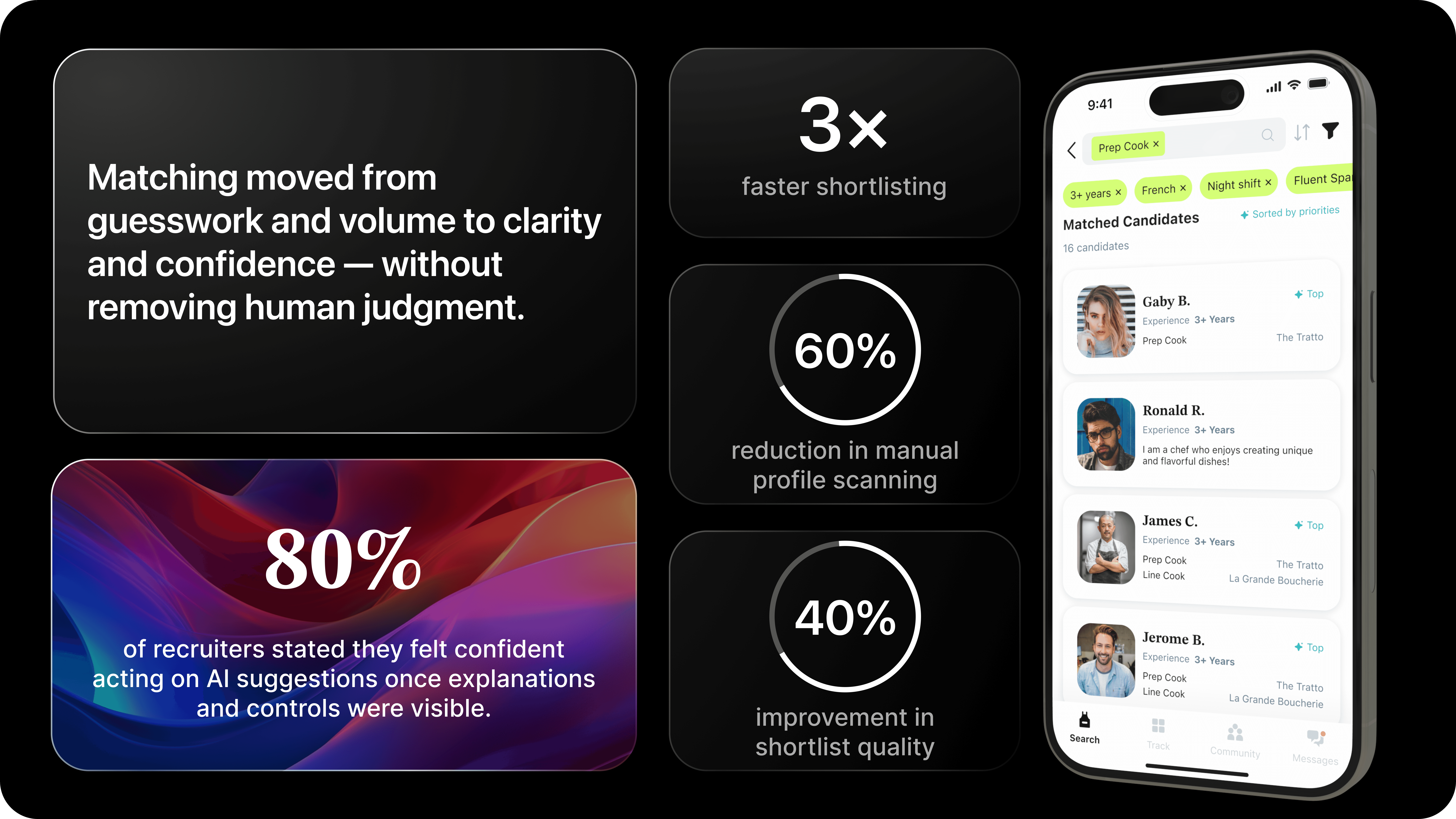 AI-assisted candidate matching that surfaces best-fit talent in seconds while keeping recruiters in control.