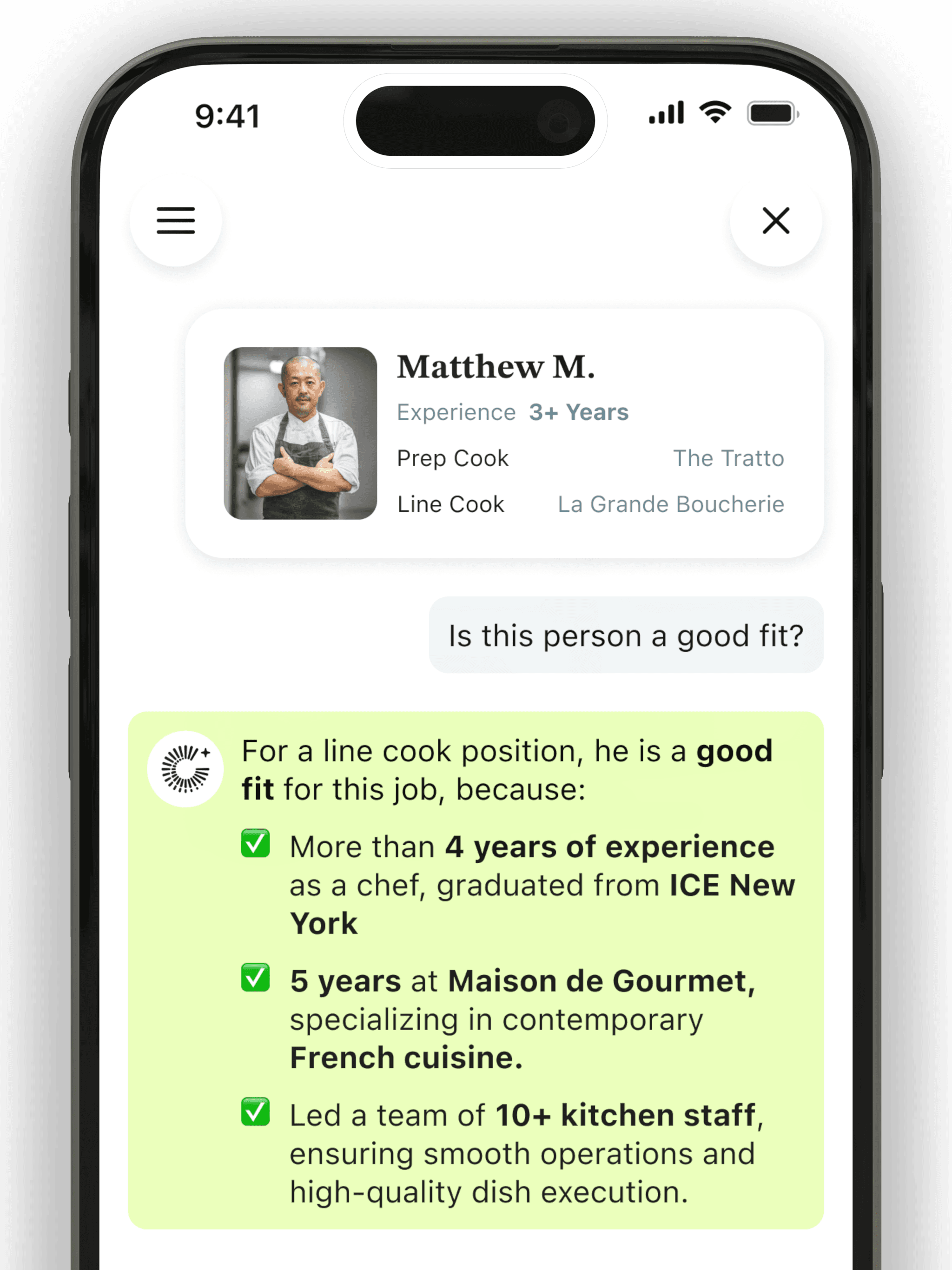 Recruiters can interact with an AI chat per candidate to ask follow-up questions and understand why someone is a strong fit. Explanations are concise, grounded in real signals, and easy to verify.