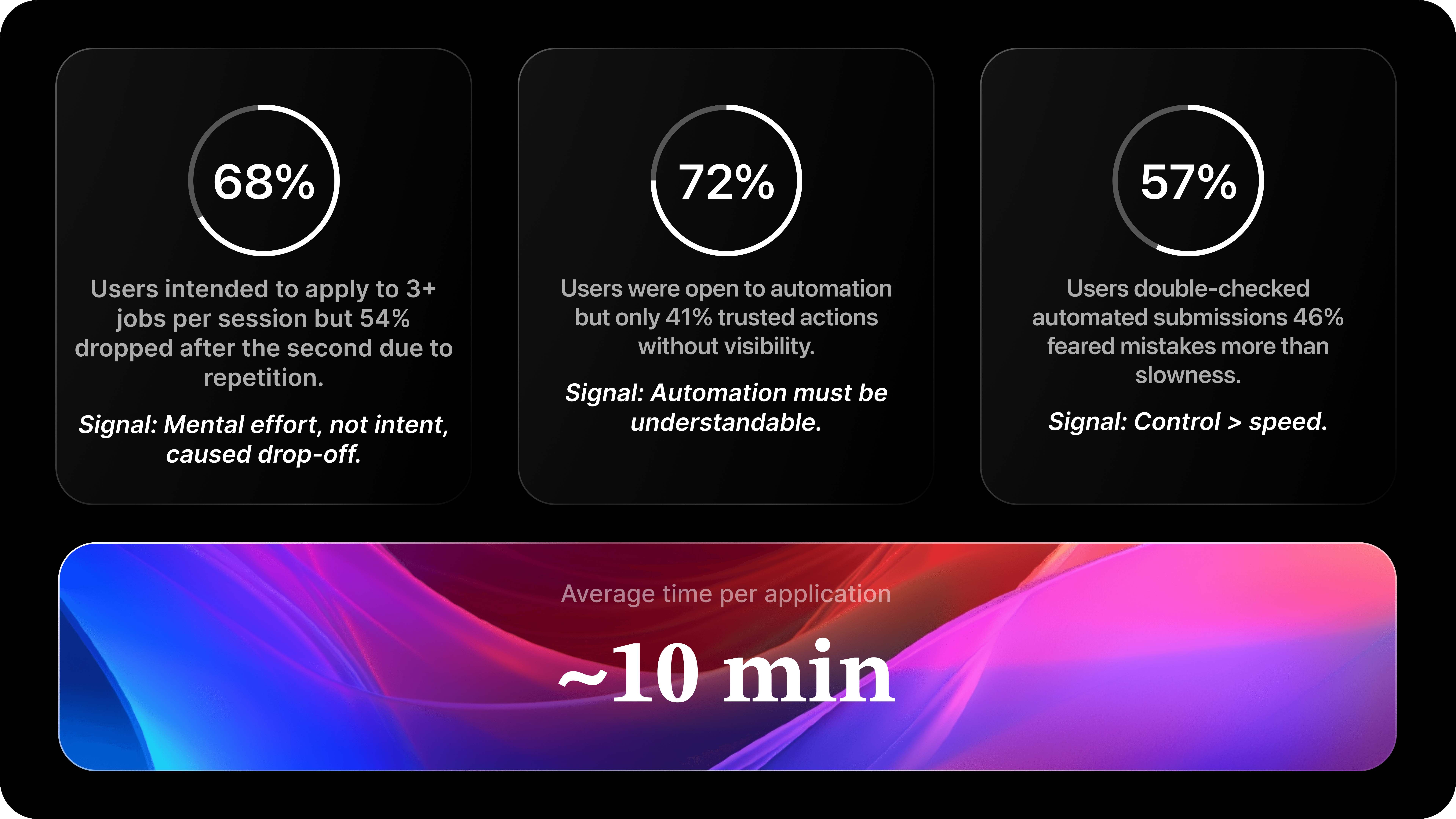 Through user interviews, flow analysis, and drop-off data, we identified that the biggest friction in job applications wasn’t form length — it was repetition, decision fatigue, and uncertainty about what the system was doing on their behalf. Users were not struggling with understanding questions, but with having to answer the same ones again and again across different jobs.
