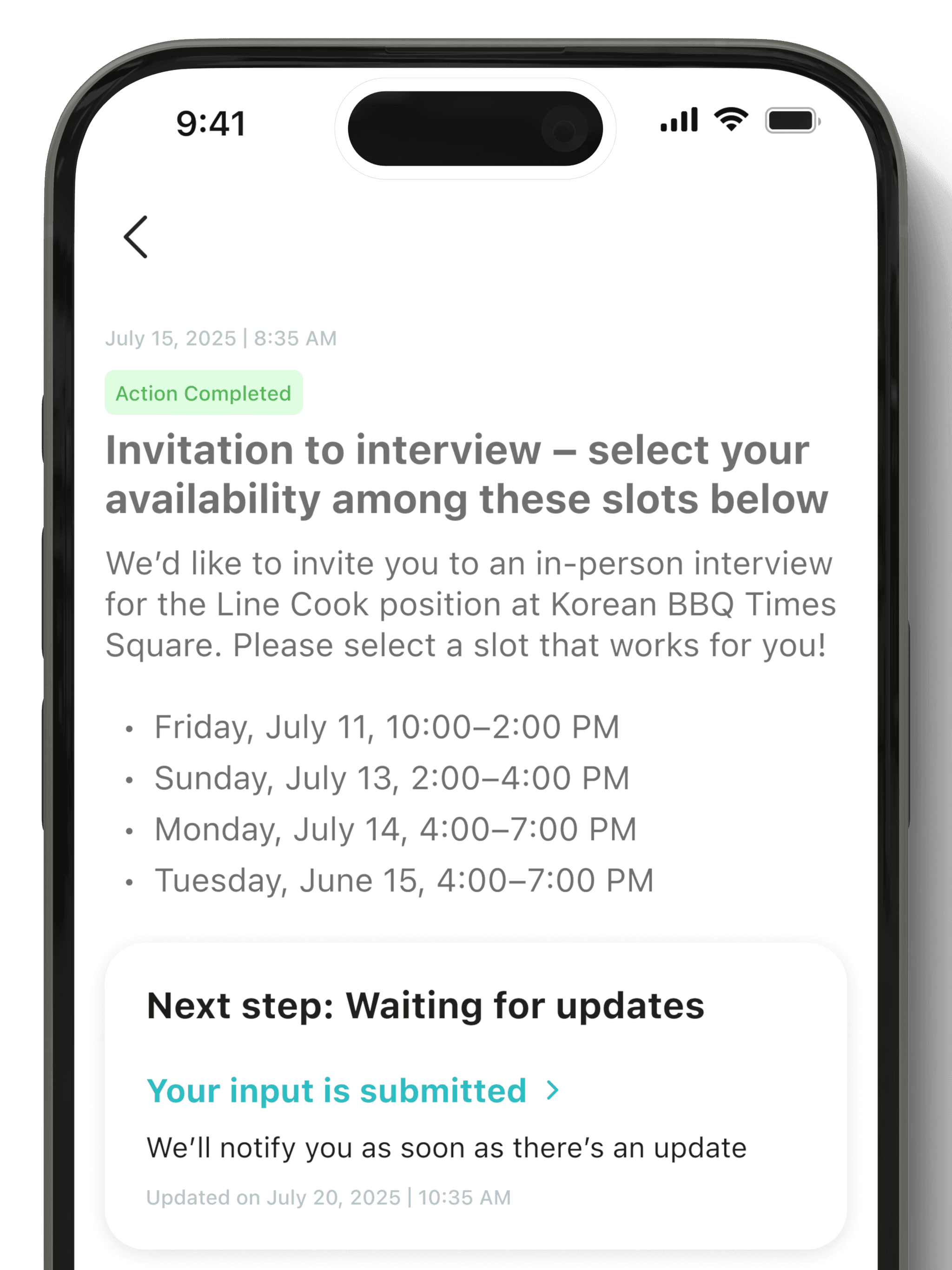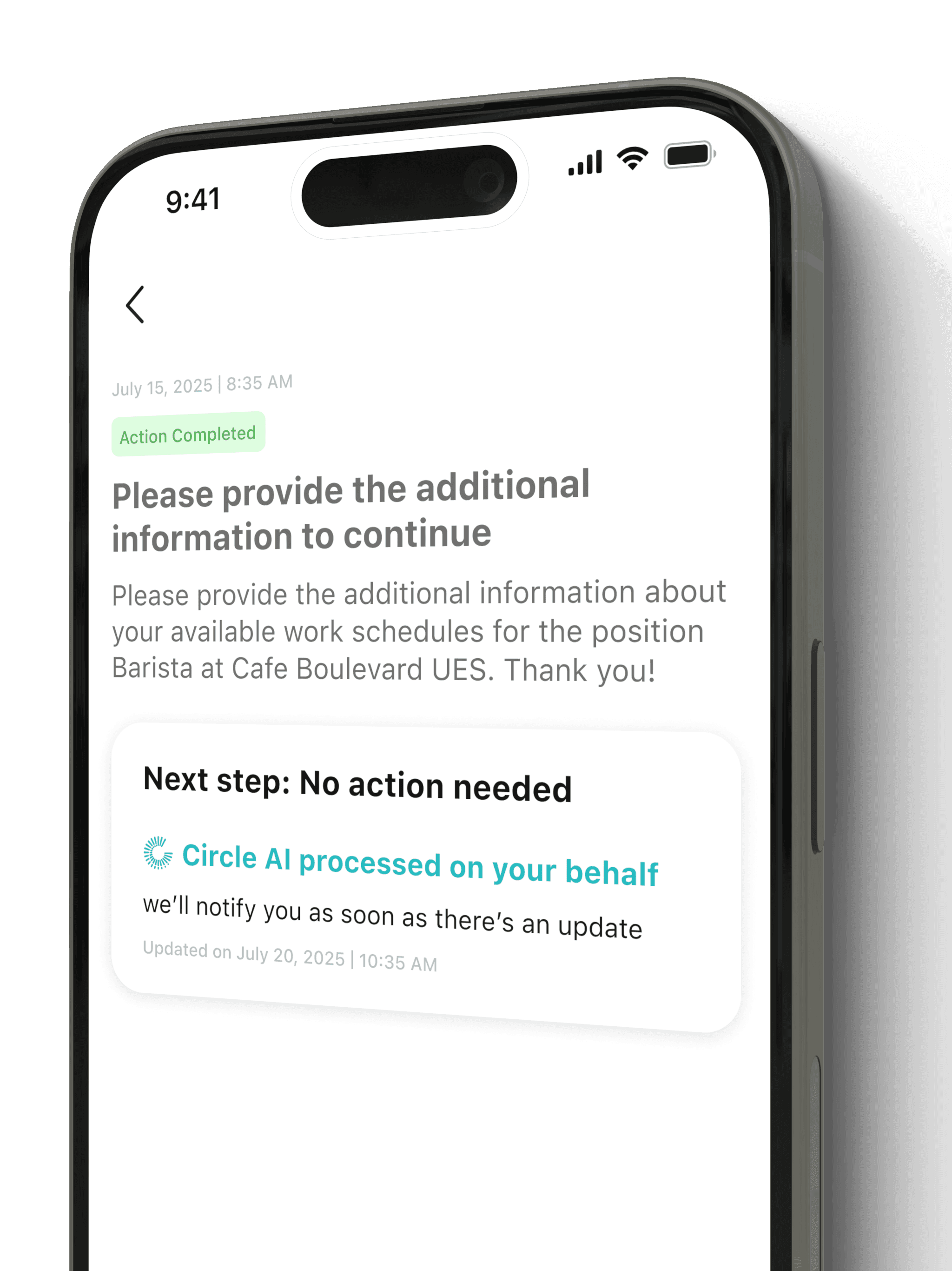 Long application forms are replaced with a short confirmation view. Users review what will be applied instead of re-entering data.