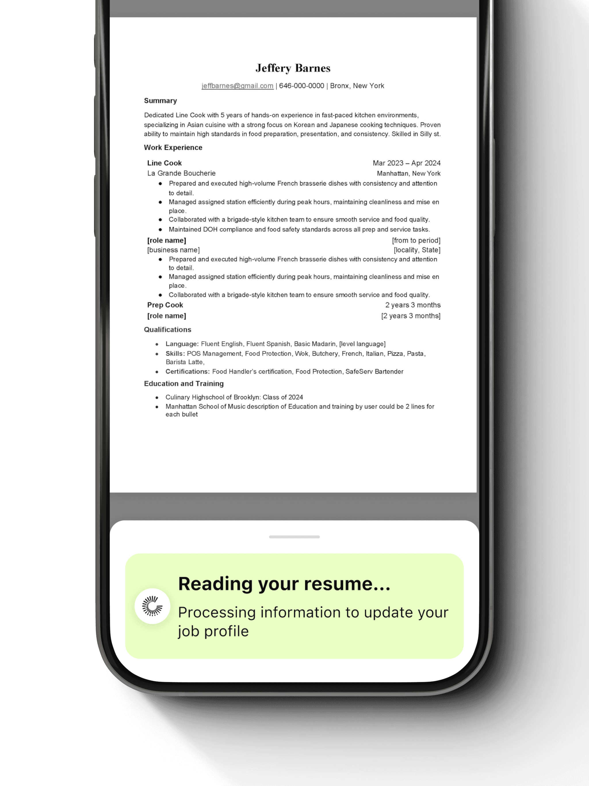 Profile setup is lightweight and progressive. Parsed resume data is previewed and fully editable, reinforcing accuracy and trust from the first interaction.