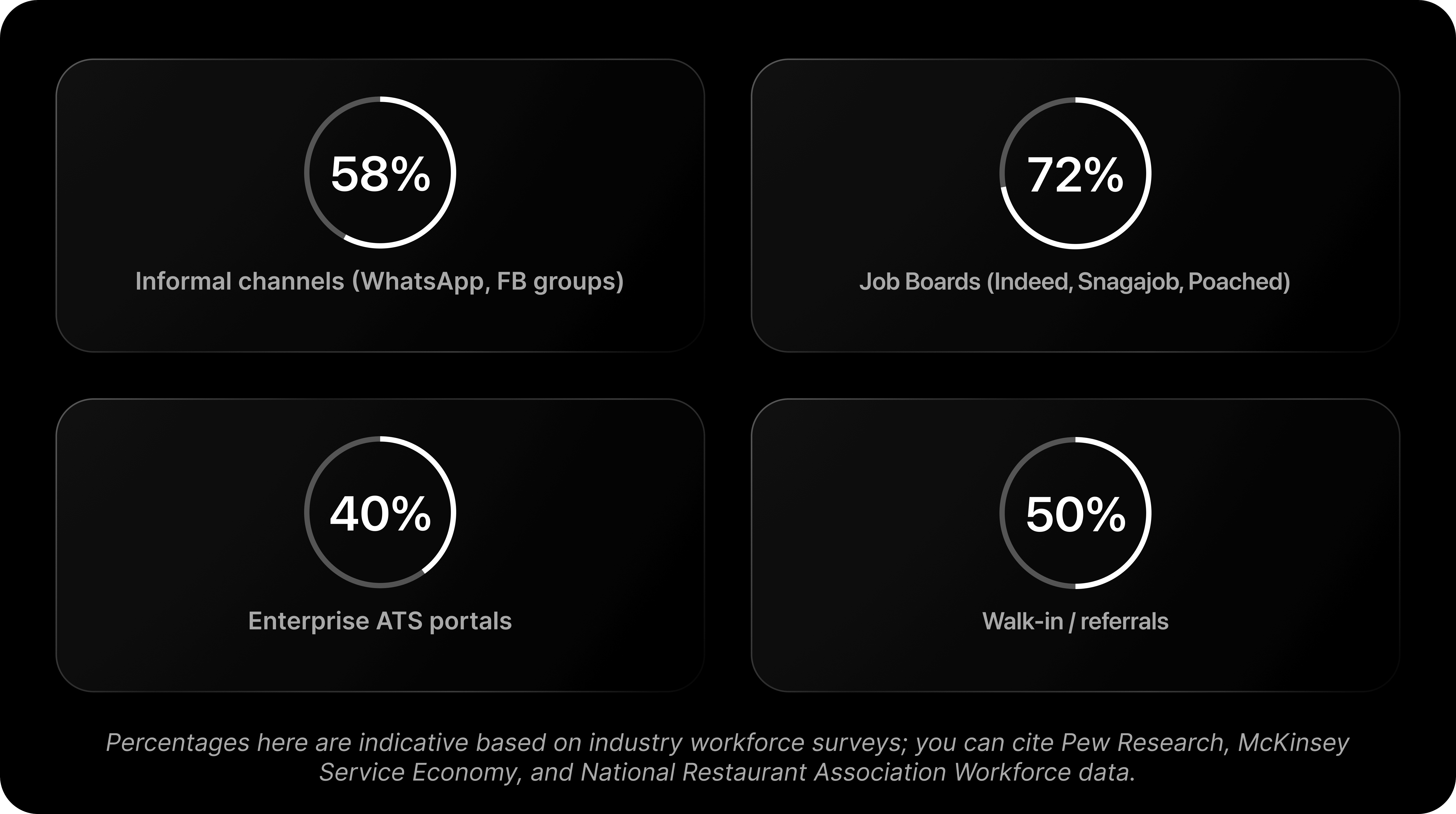 Before designing any solution, we needed to deeply understand why frontline hiring in the U.S. F&B sector is fundamentally broken — not just visually outdated, but structurally misaligned with how hourly, gig, and migrant workers actually look for jobs.
