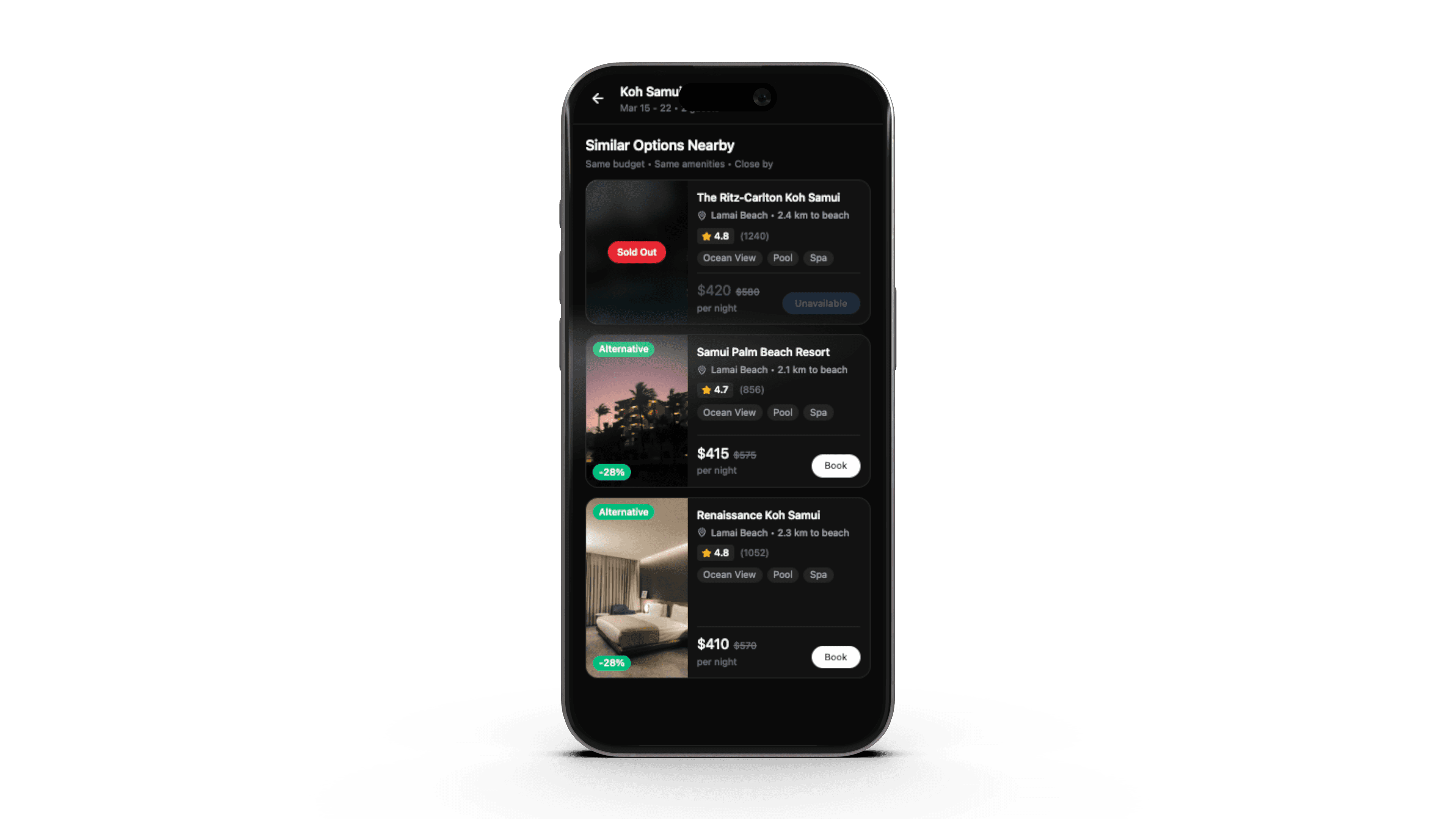Instead of stopping the journey, the system analyzes nearby availability, pricing signals, and similar listings to provide actionable alternatives within the same interface.